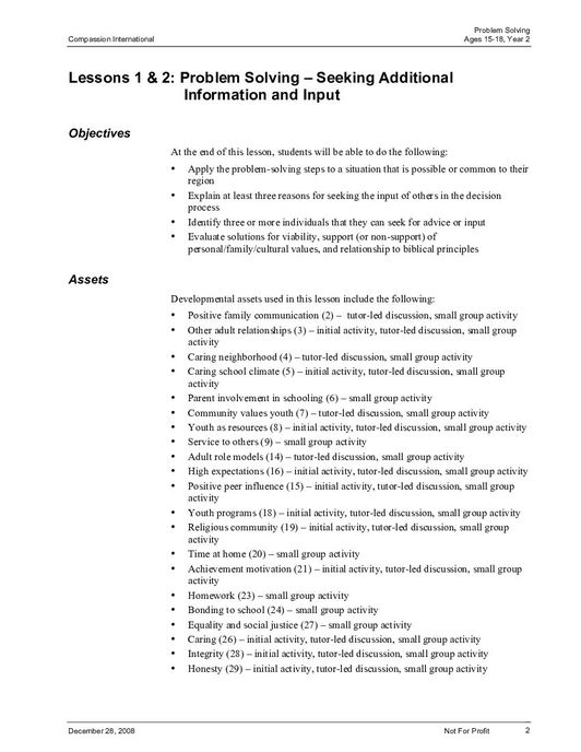 This collection of two lessons builds on the information presented in Year 1 of this same topic of curriculum, and trains students to apply problem-solving skills to real-life situations. Both Lessons 1 and 2 ask students to apply problem-solving steps toward a possible solution to a problem in their community or region. Students will learn the value of talking to others in the community in order to seek ideas and input. These lessons reinforce positive communication skills, high expectations, motivation, integrity, and planning. The lessons are 45 minutes long and are flexible in group size. The lessons include a detailed lesson plan, lists of materials needed, and questions to help guide a constructive conversation.