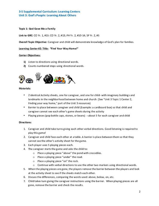 The “Supplemental Curriculum Unit 3- God’s People: Learning About Others,” teaches children about God’s plan for families. The curriculum consists of two topics, “God gave me a family” and “ Friends and Other Adults in my Life”, with six learning center activities for each topic. The Supplemental Curriculum is based upon a learning center methodology and this curriculum offers specific directions and tools for how to utilize the learning centers as an extension of the learning experiences. This learning center methodology provides age appropriate holistic child development opportunities for caregivers and children to be actively involved in learning together.