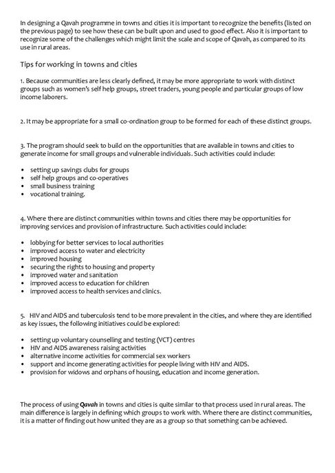 Qavah is a series of training materials created by Compassion International to empower communities and families to solve challenges utilizing resources at their disposal. Qavah is a Hebrew word which means ‘binding together, eagerly waiting, hoping for and expecting’. This term captures a sense of optimism and hope, along with the idea of working together, which is essential for positive, lasting change to take place. The purpose of this Briefing Paper is to explore the differences between utilizing Qavah in rural settings and urban settings.