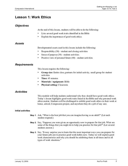 This collection of two lessons builds on the concepts presented in Year 1 of this same topic, teaching students the value of work ethics and team work. Lesson 1 walks students through work ethics identified in the Bible, and builds their sense of responsibility and purpose while fostering a positive outlook for their personal futures. Lesson 2 helps students identify characteristics of good teamwork and enables them to exhibit these characteristics through practical application. The lessons are 45 minutes long and are meant for an entire class, utilizing small group time as well. Each of the two lessons includes a detailed lesson plan, lists of materials needed, and questions to help guide a constructive conversation.