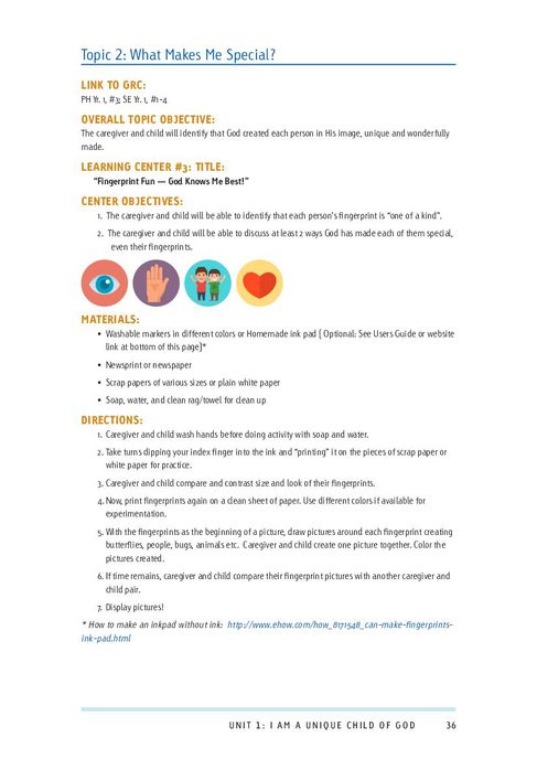 This document is a part of the Supplemental Curriculum (3-5 Year Old), which is a set of resources designed to accompany Compassion International’s Global Resource Curricula (GRC) to provide a rich, interactive learning experience for caregivers and children ages 3-5, with age appropriate and developmentally integrated curriculum. Unit 1: I Am a Unique Child of God, contains lessons on the following topics: “I Am God’s Beloved Child” and “What Makes Me Special?”