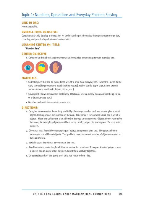 This document is a part of the Supplemental Curriculum (3-5 Year Old), which is a set of resources designed to accompany Compassion International’s Global Resource Curricula (GRC) to provide a rich, interactive learning experience for caregivers and children ages 3-5, with age appropriate and developmentally integrated curriculum. Unit 8: I Can Learn: Early Mathematical Foundations, contains lessons on the following topics: “Number, Operations, and Everyday Problem Solving” and “Shapes, Patterning, Spatial Reasoning and Measurement.”