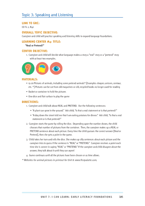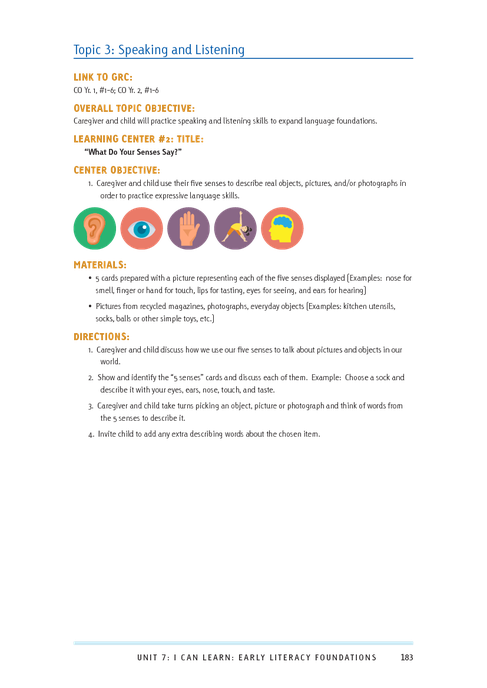 This document is a part of the Supplemental Curriculum (3-5 Year Old), which is a set of resources designed to accompany Compassion International’s Global Resource Curricula (GRC) to provide a rich, interactive learning experience for caregivers and children ages 3-5, with age appropriate and developmentally integrated curriculum. Unit 7: I Can Learn: Early Literacy Foundations, contains lessons on the following topics: “Pre-Writing Fun,” “Letter and Word Recognition” and “Speaking and Listening.”
