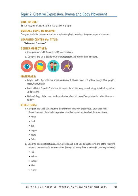 This document is a part of the Supplemental Curriculum (3-5 Year Old), which is a set of resources designed to accompany Compassion International’s Global Resource Curricula (GRC) to provide a rich, interactive learning experience for caregivers and children ages 3-5, with age appropriate and developmentally integrated curriculum. Unit 10: I Am Creative: Expression Through the Fine Arts, contains lessons on the following topics: “Creative Expression: Music,” “Creative Expression: Drama and Body Movement,” “Creative Expression: Arts and Crafts” and “Creative Writing.”