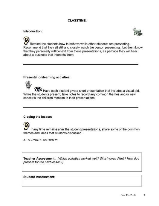 The lesson “Business Interview Presentation” give the children the chance to actually present the report to the class that was prepared in the last lesson. Following all the presentations, the class will review common themes discovered in small businesses in the community. The lesson includes guided instructions for the teacher, including preparation, a script, and suggested activities to facilitate further learning in a fun and interactive manner. This lesson is designed for children between 9-11 years, and is the 20th lesson in the 1st Year “Introduction to Business” unit.