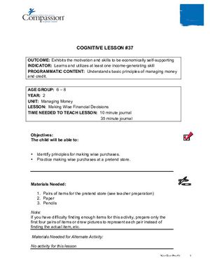 The lesson “Making Wise Financial Decisions” helps to develop motivation and knowledge in children to enable them to be economically self-supporting in the future and helps them to understand the basic principles of managing money and credit. The children will gain an understanding of what it means to make wise purchases and the principles involved. They will each practice making a wise purchase at a pretend store. The lesson includes guided instructions for the teacher, including preparation, a script, and suggested activities to facilitate further learning in a fun and interactive manner. This lesson is designed for children between 6-8 years, and is the 37th lesson in the 2nd Year “Managing Money” unit.
