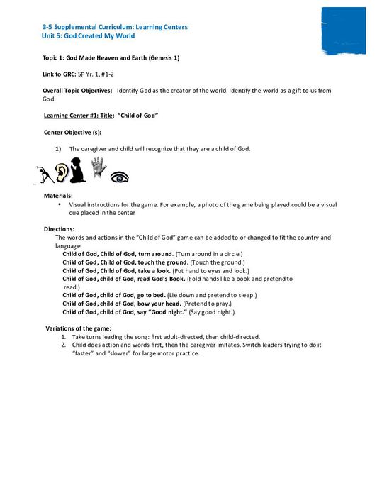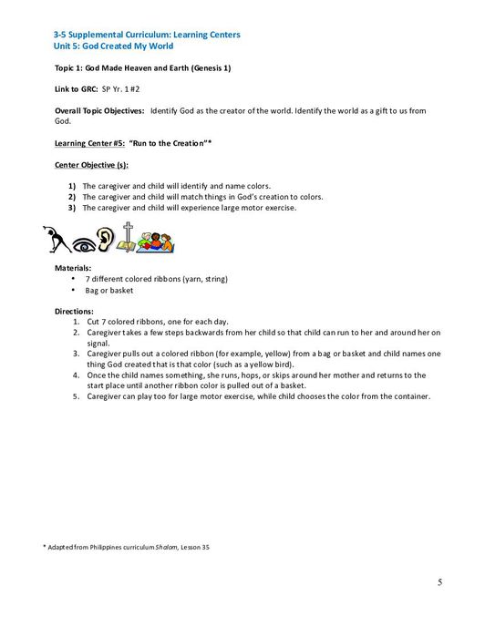 The “Supplemental Curriculum Unit 5- God Created My World,” helps children identify God as creator of the world and the world as a gift from God. The curriculum consists of two topics, “God Made Heaven and Earth” and “I Can Help Protect God’s World and Its Creatures”, with six learning center activities for each topic. The Supplemental Curriculum is based upon a learning center methodology and this curriculum offers specific directions and tools for how to utilize the learning centers as an extension of the learning experiences. This learning center methodology provides age appropriate holistic child development opportunities for caregivers and children to be actively involved in learning together.