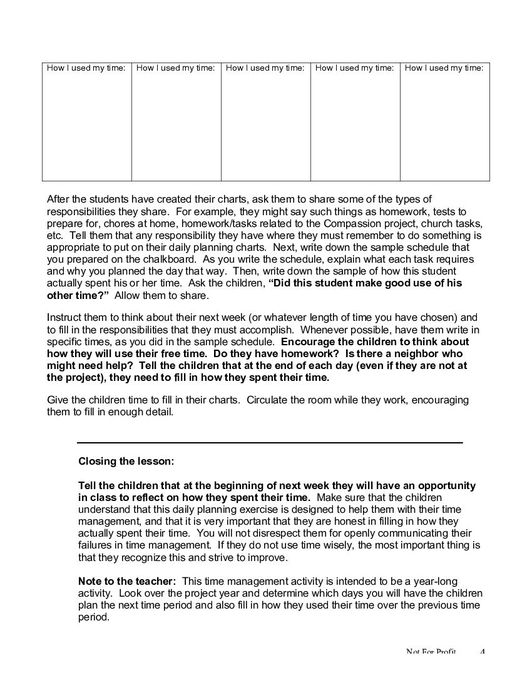 The lesson “Time Management” teaches children the consequences of not managing their time well and provides the use of a “Daily Planning Chart” for the children to honestly reflect on and evaluate their own use of time. The children will learn a memory tool to memorize a list of items, and be able to incorporate that tool to daily manage their time in the future. The lesson includes guided instructions for the teacher, including preparation, a script, and suggested activities to facilitate further learning in a fun and interactive manner. This lesson is designed for children between 9-11 years, and is the 7th lesson in the 1st Year “Study Skills” unit.