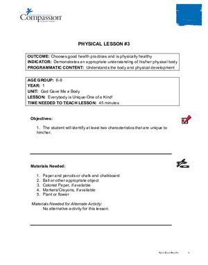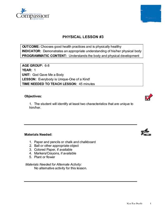 The lesson “Everybody is Unique: One of a Kind” is part 3 of a 42 part series on human development, the human body, health, and safety. This lesson teaches thateach person is special, unique and precious to God. This resource includes a lesson plan for the teacher on how to prepare beforehand, class-time content to facilitate learning,hands-on activities facilitating further learning, and a teacher assessment at the end. This lesson is designed for a group of young children between the ages of 6 and 8, and is the third physical development lesson in the Core Curriculum, 6-8 years, Year One.