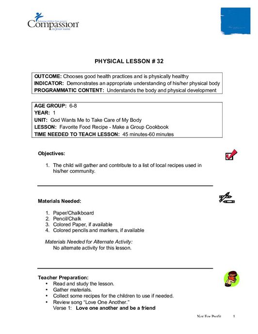 The lesson “Favorite Food Recipe-Make a Group Cookbook” is part 32 of a 42 part series on human development, the human body, health, and safety. This lesson instructs a class in how to put together a cookbook of local recipes. This resource includes a lesson plan for the teacher on how to prepare beforehand, class-time content to facilitate learning, hands-on activities facilitating further learning, and a teacher assessment at the end. This lesson is designed for a group of young children between the ages of 6 and 8, and is the thirty-second physical development lesson in the Core Curriculum, 6-8 years, Year One.