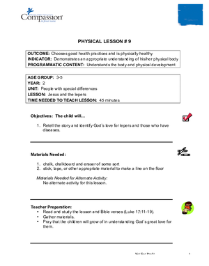 The lesson “Jesus and the Lepers” is part nine of a 44 part series on human development, family, health, and safety. This lesson teaches the Bible story about Jesus being kind to and healing ten lepers. This resource includes a lesson plan for the teacher on how to prepare beforehand, class-time content to facilitate learning, hands-on activities facilitating further learning, and a teacher assessment at the end. This lesson is designed for a group of young children between the ages of 3 and 5, and is the ninth physical development lesson in the Core Curriculum, 3-5 years, Year Two.