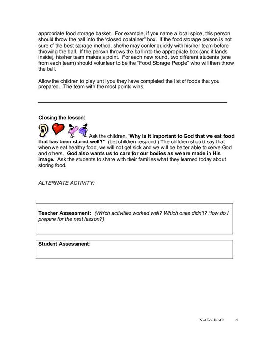 The lesson “Storing Food at Home” is part 26 of a 35 part series on human development, the human body, health, and safety. This lesson teaches about safe containers for storing food and other food safety rules, like storing food at the correct temperatures. This resource includes a lesson plan for the teacher on how to prepare beforehand, class-time content to facilitate learning, hands-on activities facilitating further learning, and a teacher assessment at the end. This lesson is designed for a group of children between the ages of 9 and 11, and is the twenty-sixth physical development lesson in the Core Curriculum, 9-11 years, Year Two.