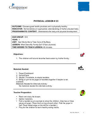 The lesson “What Does My Family Eat?” is part 23 of a 42 part series on human development, the human body, health, and safety. This lesson instructs thechildren to make a food journal with pictures of food their family often eats. This resource includes a lesson plan for the teacher on how to prepare beforehand, class- time content to facilitate learning, hands-on activities facilitating further learning, and a teacher assessment at the end. There is also an alternative activity suggested. This lesson is designed for a group of young children between the ages of 6 and 8, and is thetwenty-third physical development lesson in the Core Curriculum, 6-8 years, Year One.