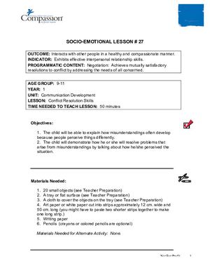 The lesson “Conflict Resolution Skills” teaches children to demonstrate appropriate and positive strategies in conflict situations, including the skill of negotiation. The children will explain how misunderstandings often develop because people perceive things differently. Each child will demonstrate how he or she will resolve problems that arise from misunderstandings though talking about how each party perceived the situation. The lesson includes guided instructions for the teacher, including preparation, a script, and suggested activities to facilitate further learning in a fun and interactive manner. This lesson is designed for children between 9-11 years, and is the 27th lesson in the 1st year Core Curriculum Set and part of the “Communication Skills” unit.