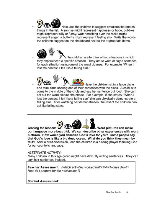 The lesson “Express Self Creatively” teaches children how to relate at least two emotions to objects or elements in nature. Children how to describe emotions through the use of word pictures, and realize that God understands and accepts all emotion. The lesson includes guided instructions for the teacher, including preparation, a script, and suggested activities to facilitate further learning in a fun and interactive manner. This lesson is designed for children between 6-8 years, and is the 22nd lesson in the 1st Year Core Curriculum Set and part of the “Communication Skills” unit.