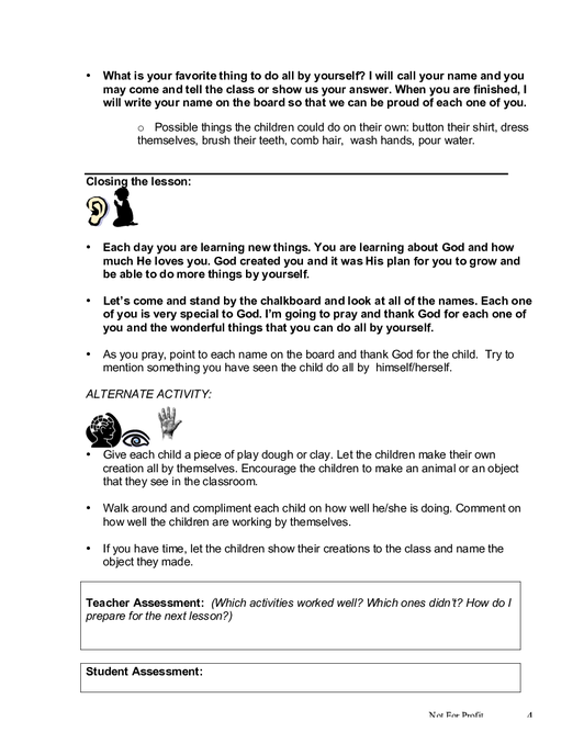 The lesson “I Can Do it Myself” teaches children to identify at least three self-care activities that he or she can successfully do for himself or herself. The children are encouraged to feel proud of what he or she can accomplish on his or her own and are asked to demonstrate those activities in front of the class. The lesson includes guided instructions for the teacher, including preparation, a script, and suggested activities to facilitate further learning in a fun and interactive manner. This lesson is designed for children between 3-5 years, and is the thirteenth lesson in the 1st Year Core Curriculum Set and part of the “Self Awareness” unit.