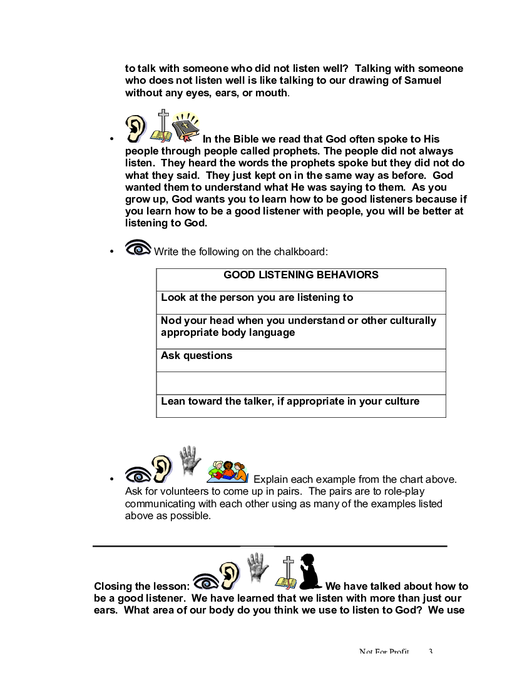 The lesson “Listening Skills (Part 2)” is a continuation of Part 1 in the series that teaches children the importance of listening and how to improve on listening skills. Children learn to demonstrate good eye contact, how to ask questions, repeating back what is heard, and responding supportively. The children will also learn about listening prayer, as he or she asks God to speak to his or her heart. The lesson includes guided instructions for the teacher, including preparation, a script, and suggested activities to facilitate further learning in a fun and interactive manner. This lesson is designed for children between 6-8 years, and is the 25th lesson in the 1st Year Core Curriculum Set and part of the “Communication Skills” unit.