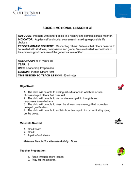 The lesson “Putting Others First” teaches children about interacting with other people in a healthy and compassionate manner, emphasizing respect, kindness, compassion, and serving others. The children will verbalize situations where it is appropriate to choose putting others first over self. Each child will demonstrate empathic thoughts and responses towards others and determine one strategy to use that promotes delayed gratification. The children will also learn about how Jesus put them first by dying on the cross and He wants to emulate this attitude of servitude. The lesson includes guided instructions for the teacher, including preparation, a script, and suggested activities to facilitate further learning in a fun and interactive manner. This lesson is designed for children between 9-11 years, and is the 36th lesson in the 2nd year Core Curriculum Set and part of the “Leadership Preparation” unit.
