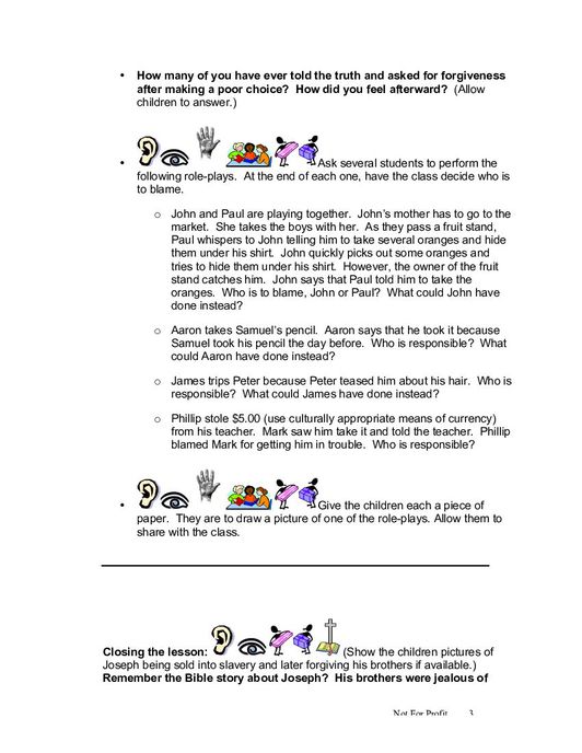 The lesson “Takes Responsibility for Own Actions” teaches to apply self and social awareness in making responsible life choices. Specifically, the children learn to distinguish responsibility and forgiveness in various life situations, with an emphasis on the importance of forgiveness as a part of Godly character. The lesson includes guided instructions for the teacher, including preparation, a script, and suggested activities to facilitate further learning in a fun and interactive manner. This lesson is designed for children between 6-8 years, and is the 39th lesson in the 1st Year Core Curriculum Set and part of the “Emotional Development” unit.