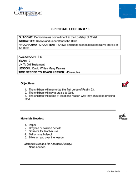 The lesson “David Writes Many Psalms” teaches children about praising God and David’s commitment to loving and praising God through Psalms. The children will memorize the first verse of Psalm 23, sing praises to God, and name at least one reason why it is important to be praising God each day. The lesson includes guided instructions for the teacher, including preparation, a script, and suggested activities to facilitate further learning in a fun and interactive manner. This lesson is designed for children between 3-5 years, and is the 18th lesson in the 2nd Year Core Curriculum Set and part of the “Old Testament” unit.