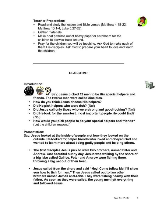 The lesson “Jesus Chooses His Disciples” teaches children about how Jesus chose 12 men to be His disciples based on their Godly character. The children will count the disciples together and identify some of the things each of them did in the Bible stories. Each child will name one or more ways he or she can be a Godly friend or person, just as the disciples were. The lesson includes guided instructions for the teacher, including preparation, a script, and suggested activities to facilitate further learning in a fun and interactive manner. This lesson is designed for children between 3-5 years, and is the 29th lesson in the 1st Year Core Curriculum Set and part of the “New Testament” unit.