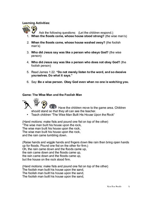 The lesson “Jesus’ Parable – House on the Rock” teaches children about obedience and listening to God. The children will identify a wise person who obeys God and a foolish person who does not obey God, discussing ways they can strive to be obedient. The lesson includes guided instructions for the teacher, including preparation, a script, and suggested activities to facilitate further learning in a fun and interactive manner. This lesson is designed for children between 3-5 years, and is the 31st lesson in the 1st Year Core Curriculum Set and part of the “New Testament” unit.