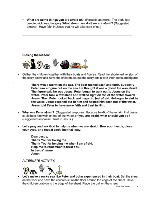 The lesson “Jesus Walks on Water” teaches children about the power of Jesus and how He calmed the storm for His disciples, even while they were fearful, walking on water. Each child will explain the meaning of faith and trust, differentiating between faith and fear, and naming ways to trust God. The lesson includes guided instructions for the teacher, including preparation, a script, and suggested activities to facilitate further learning in a fun and interactive manner. This lesson is designed for children between 3-5 years, and is the 32nd lesson in the 2nd Year Core Curriculum Set and part of the “New Testament” unit.