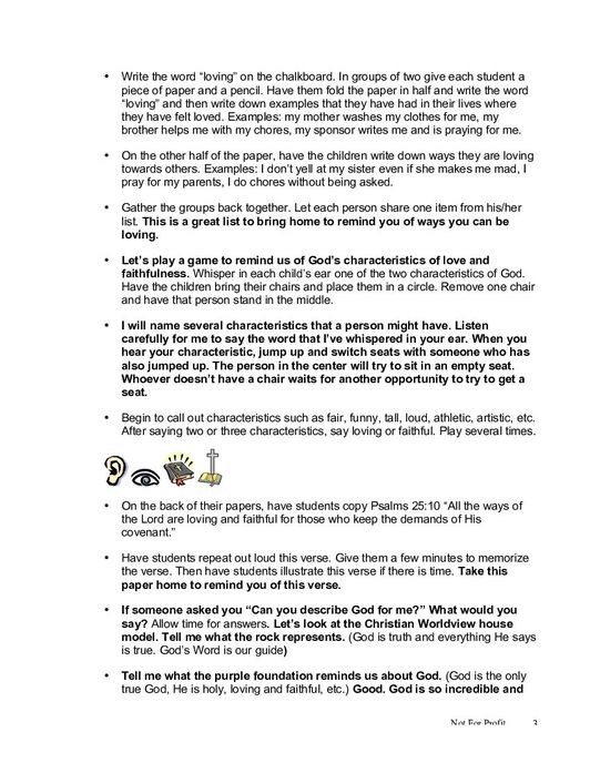At the end of this lesson the child will be able to name a way that shows that God is faithful and loving.