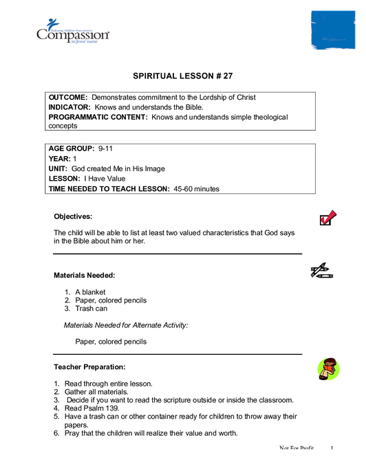 The lesson “I Have Value” explains how the Bible tells us that we each have great value and worth in God’s eyes. Each child will list at least two valued characteristics that God names in the Bible about him or her. The lesson includes guided instructions for the teacher, including preparation, a script, and suggested activities to facilitate further learning in a fun and interactive manner. This lesson is designed for children between 9-11 years, and is the 27th lesson in the 1st Year Core Curriculum Set and part of the “God Created Me in His Image” unit.