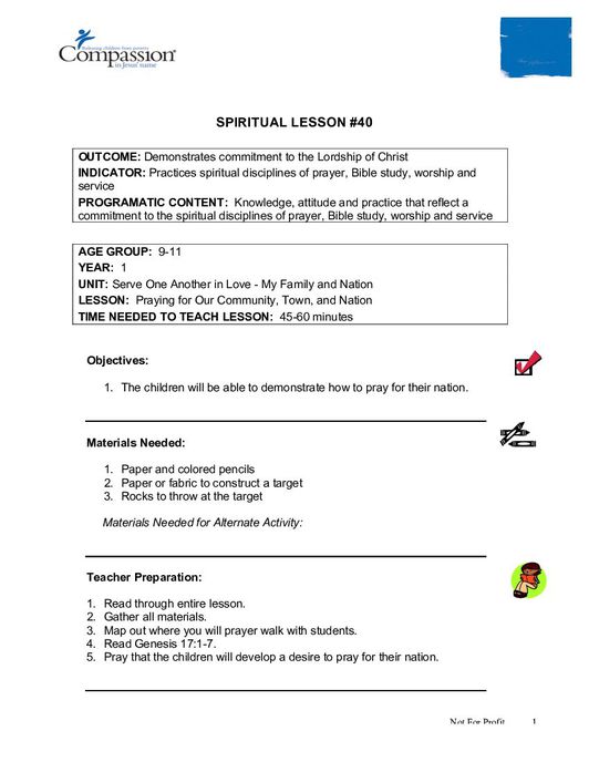 The lesson “Praying for Our Community, Town, and Nation” further teaches children the importance and power of prayer, outside of themselves and for the community at large. The children will take a prayer walk together, praying for the surrounding businesses, the church, the community, and the nation. The lesson includes guided instructions for the teacher, including preparation, a script, and suggested activities to facilitate further learning in a fun and interactive manner. This lesson is designed for children between 9-11 years, and is the 40th lesson in the 1st Year Core Curriculum Set and part of the “Serve One Another in Love, - My Family and Nation” unit.